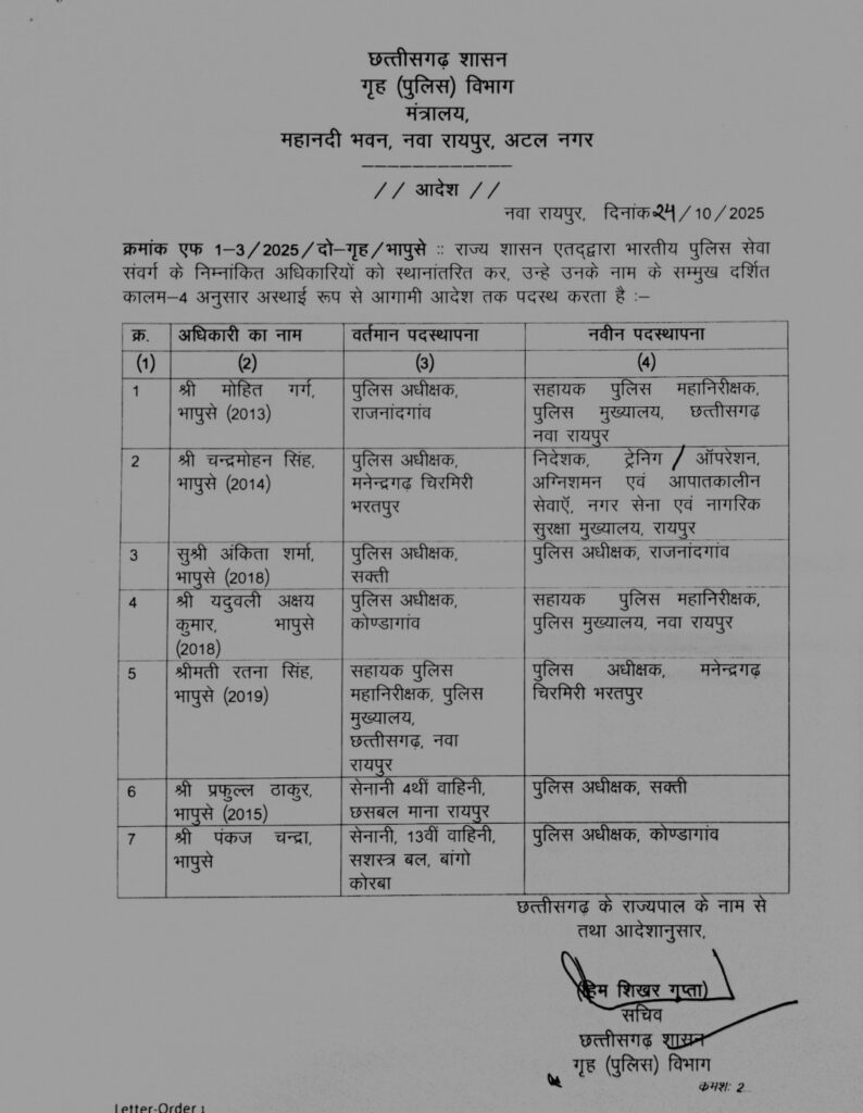 नई पदस्थापना – निदेशक, ट्रेनिंग ऑपरेशन, अग्निशमन एवं आपातकालीन सेवाएँ, नगर सेना एवं नागरिक सुरक्षा मुख्यालय, रायपुर