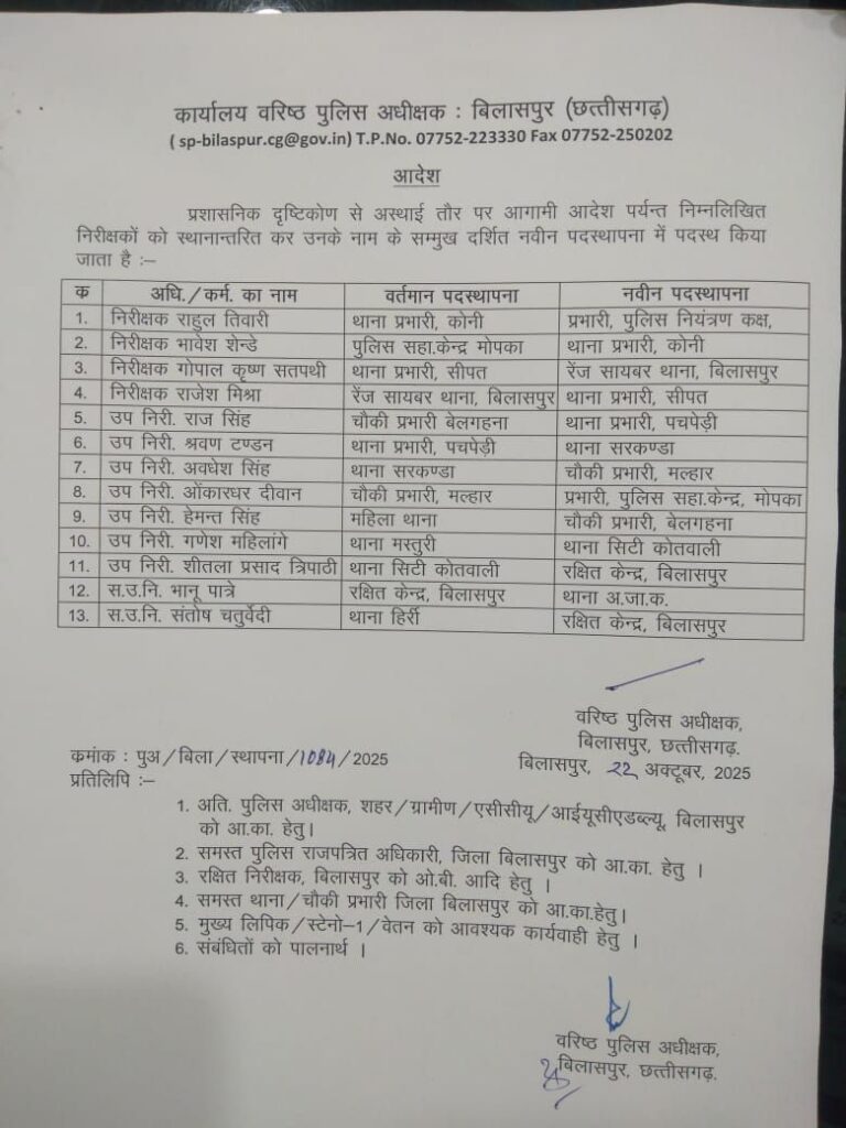 आदेश वरिष्ठ पुलिस अधीक्षक बिलासपुर द्वारा 22 अक्टूबर 2025 को जारी किया गया है।