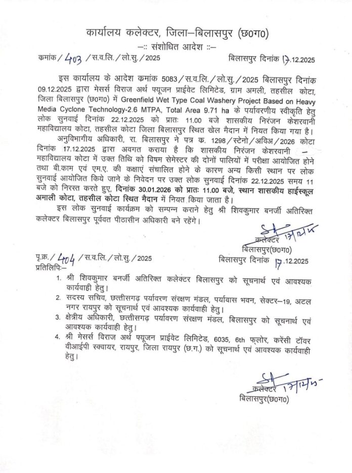 प्रशासन से प्राप्त जानकारी के अनुसार, 22 दिसंबर को कॉलेज परिसर में दो पालियों में परीक्षाएं आयोजित होने के कारण जनसुनवाई को स्थगित करने का निर्णय लिया गया है। कलेक्टर द्वारा जारी आदेश के तहत अब यह जनसुनवाई 30 जनवरी 2026 को आयोजित की जाएगी।