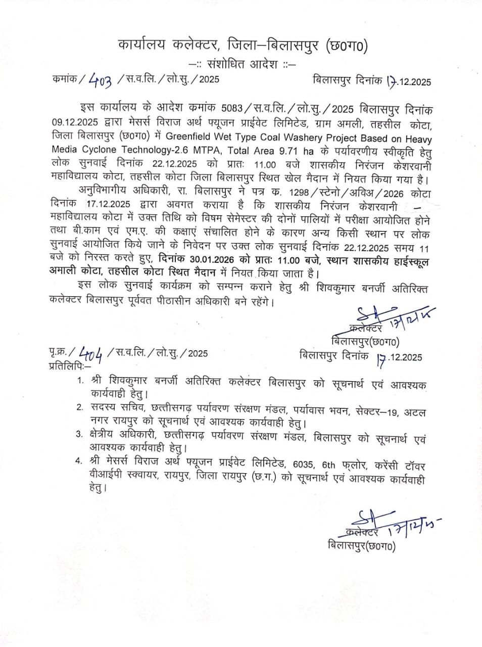 नई तिथि के अनुसार, जनसुनवाई ग्राम अमाली स्थित हाई स्कूल मैदान में सुबह 11 बजे से प्रारंभ होगी। जनसुनवाई के लिए अतिरिक्त कलेक्टर शिव कुमार बनर्जी को पूर्ववत पीठासीन अधिकारी नियुक्त किया गया है।