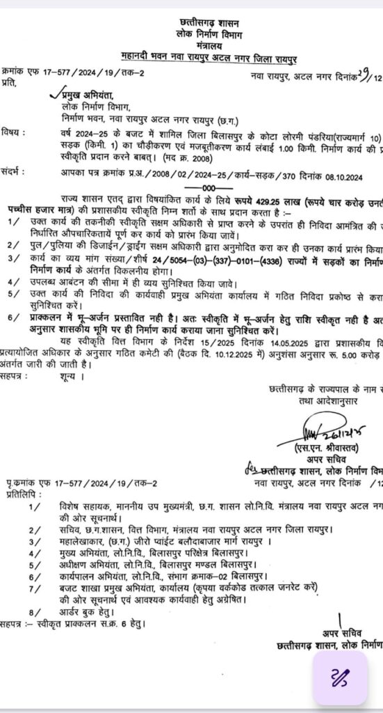 कुछ दिन पूर्व नगर पंचायत अध्यक्ष सरोज दुर्गेश साहू ने छत्तीसगढ़ शासन के उपमुख्यमंत्री अरुण साव से मुलाकात कर उक्त मार्ग के चौड़ीकरण और नवीन सड़क निर्माण की आवश्यकता से अवगत कराते हुए प्रस्ताव रखा था, जिस पर आज सकारात्मक निर्णय लेते हुए स्वीकृति प्रदान की गई।