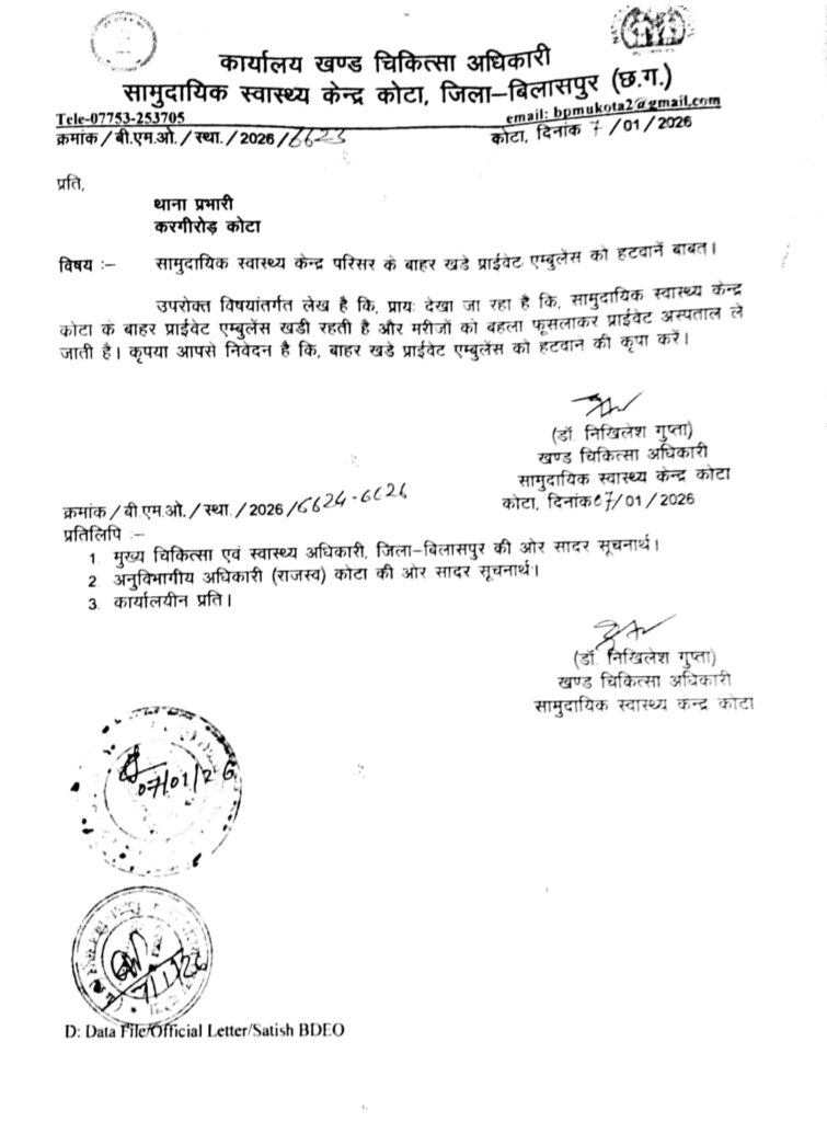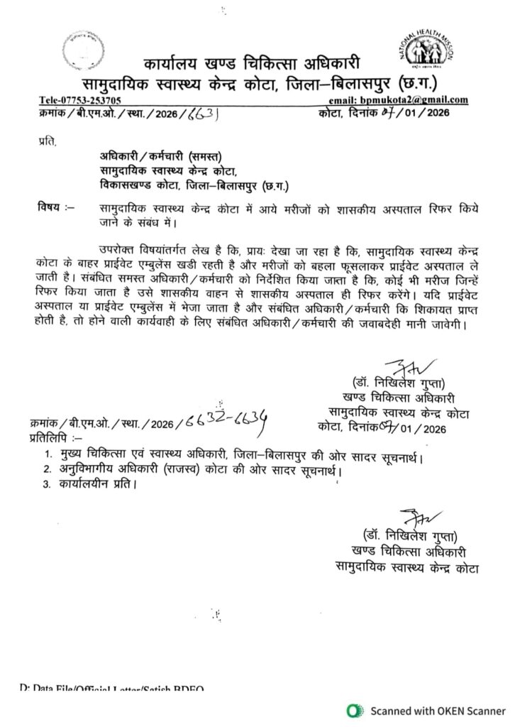मामले की गंभीरता को देखते हुए खण्ड चिकित्सा अधिकारी डॉ. निखिलेश गुप्ता ने सख्त निर्देश जारी किए हैं। उन्होंने स्पष्ट किया है कि कोटा स्वास्थ्य केंद्र से रिफर किए जाने वाले सभी मरीजों को केवल शासकीय वाहन से ही शासकीय अस्पताल भेजा जाएगा। किसी भी अधिकारी या कर्मचारी की संलिप्तता पाई जाने अथवा मरीज को प्राइवेट एंबुलेंस/निजी अस्पताल भेजे जाने पर कड़ी कार्रवाई की जाएगी।