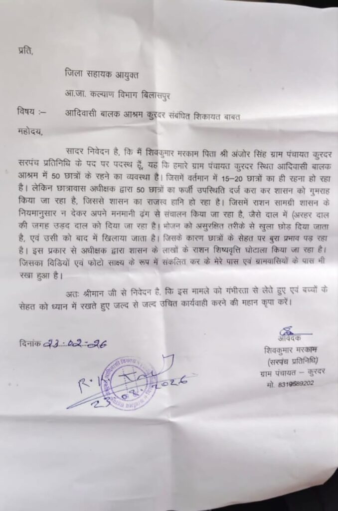 कोटा। कोटा ब्लॉक के ग्राम कुरदर में स्थित आदिवासी बालक आश्रम कुरदर एक बार फिर विवादों में आ गया है। आश्रम के अधीक्षक पर बच्चों की फर्जी उपस्थिति दर्ज कर शासन से मिलने वाली राशि और राशन के दुरुपयोग का गंभीर आरोप लगा है। ग्रामीणों और शिकायतकर्ता ने पूरे मामले की निष्पक्ष जांच कर कार्रवाई की मांग की है।